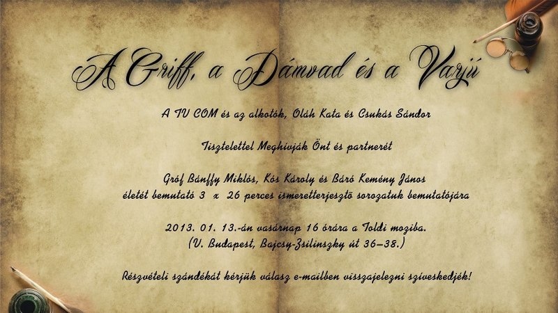 A sorozat különös aktualitása, hogy 2013-ban mindhárom szereplőnek évfordulóját ünnepeljük: gróf Bánffy Miklós 140, Kós Károly 130, báró Kemény János pedig 110 éve született. Az alkotást január 13-án mutatták be a Toldi Moziban.